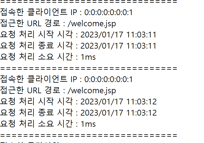 writer.println("요청 처리 소요 시간 : " + (end-start) + "ms");//1000분의 1초 단위