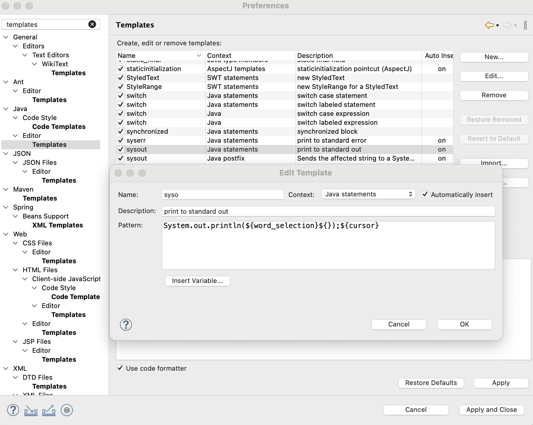 [Mac] 이클립스 자동완성 단축키 변경 , sysout -> syso 변경 본문