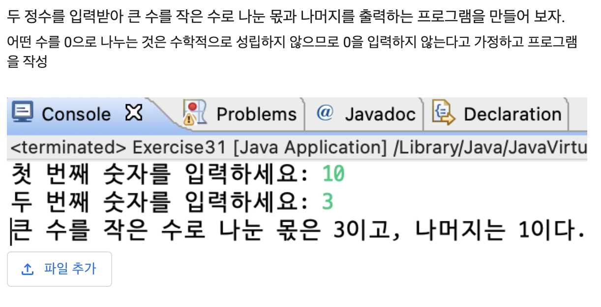 System.out.printf("큰 수를 작은 수로 나눈 몫은 %d이고 나머지는 %d이다.", big / small , big % small);