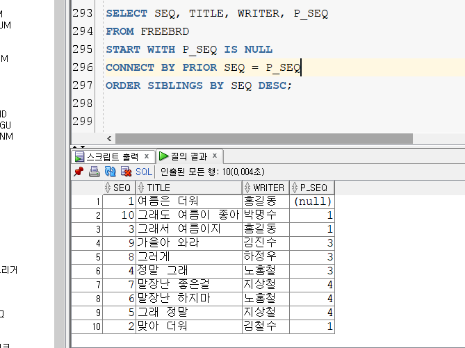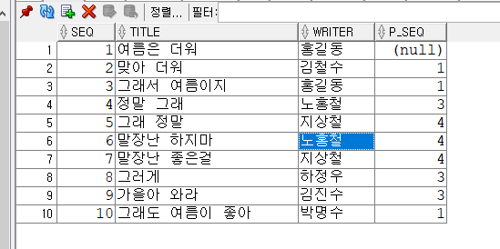SELECT SEQ, TITLE, WRITER, P_SEQ