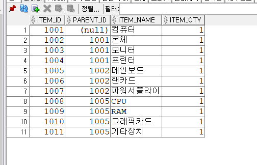 INSERT INTO BOM VALUES ( 1001, NULL, '컴퓨터', 1);