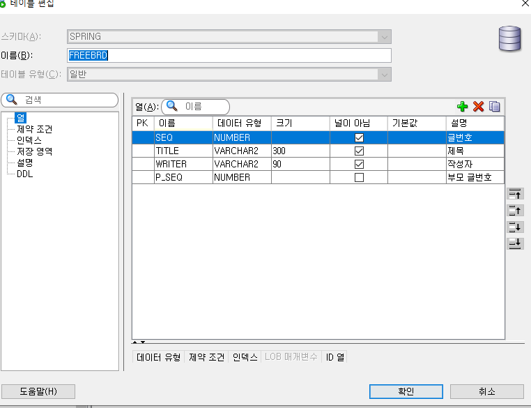 - FREEBRD 테이블 생성