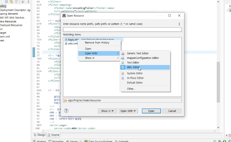 log4j를 열때는 ctrl+shift +r 에서 검색후 오른쪽에 Open with -> xml editor로 연다.