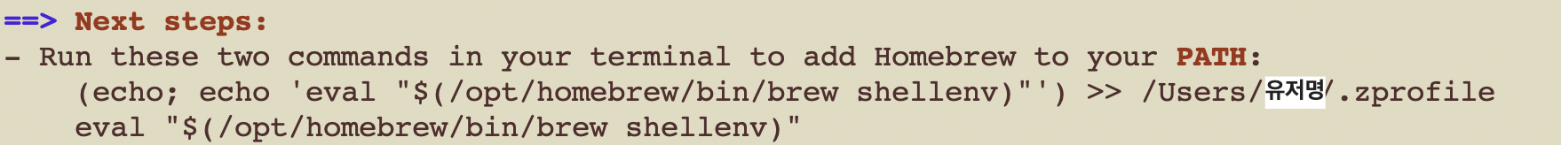 (echo; echo 'eval "$(/opt/homebrew/bin/brew shellenv)"') >> /Users/[유저명]/.zprofile