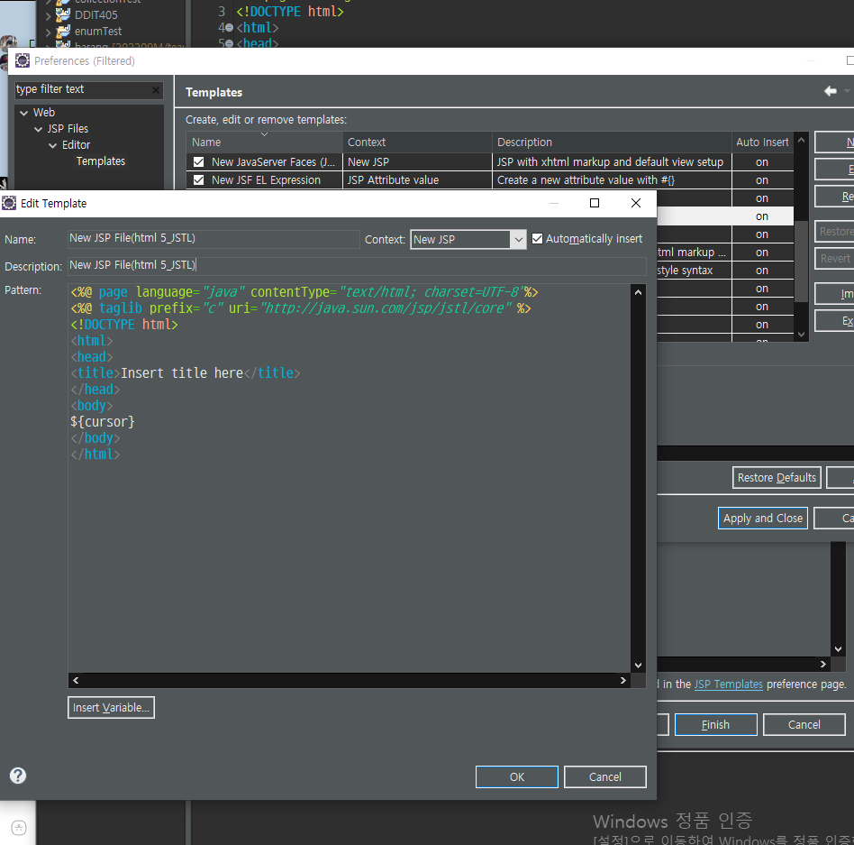 webContent -> jsp file 생성 -> 이름 설정하고 next -> jsp template에서 new edit하고 이름 설정 후