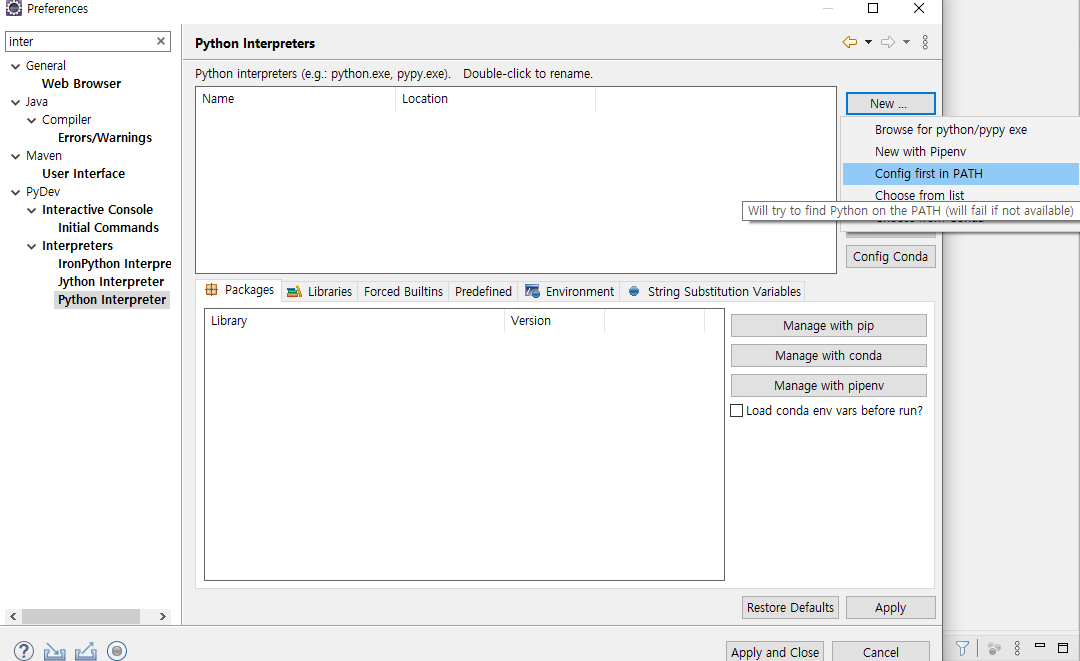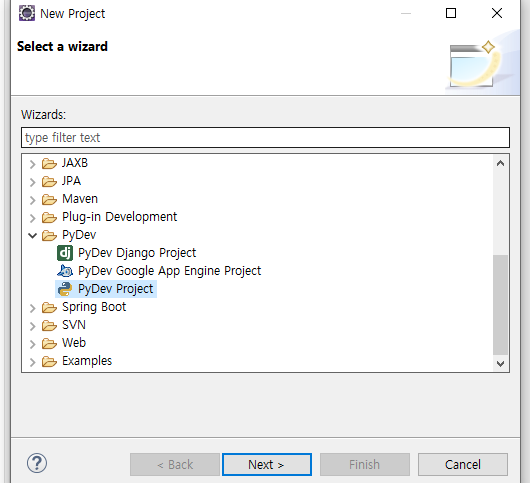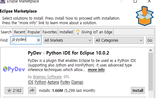 기본으로 설치되어있지 않기 때문에 python 툴을 다운 받는다 help - Eclipse Marketplace - pydev 검색 - install