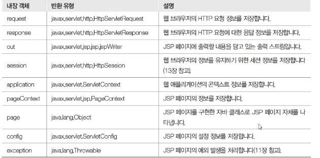 JSP 페이지에서 사용할 수 있도록 JSP 컨테이너에 미리 정의된 객체